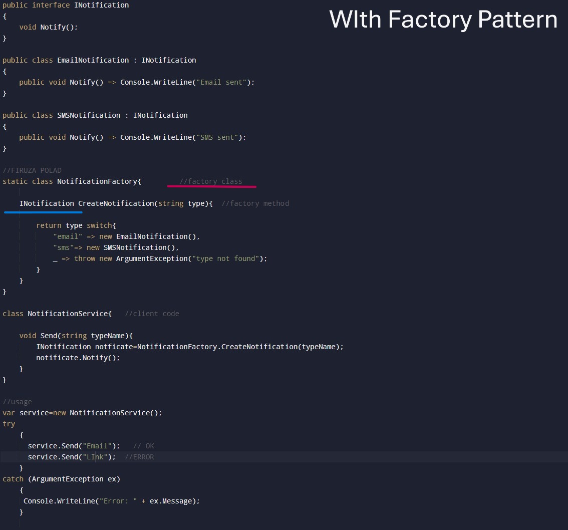 - Without Factory pattern we have problems: tightly coupling between client and
