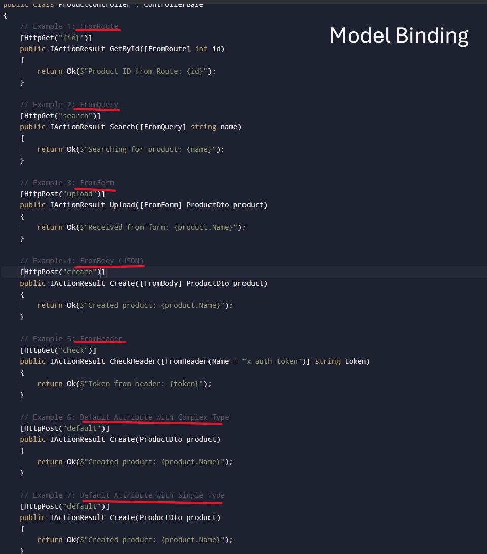 Default Binding (No Attribute): When no attribute (like above) is used, then frameworks choose the source automatically based on parameter type. So, simple types like int, string, bool, datetime bind from Route, QueryString, Form source.