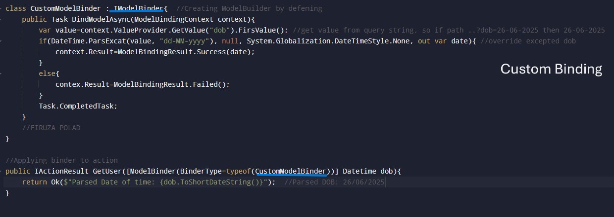 Eg: Lets say user sends date in format "dd-MM-yyyy" from the query string (like ?dob=26-06-2025), but by default we expects something "yyyy-mm-dd" like 2025-06-26. So if user send 26-06-2025 then model binding fails. To solve it we override the excepted format, we convert it into valid DateTime object, even if system except yyyy-mm-dd, code will work without client needing change their format. (see below image)