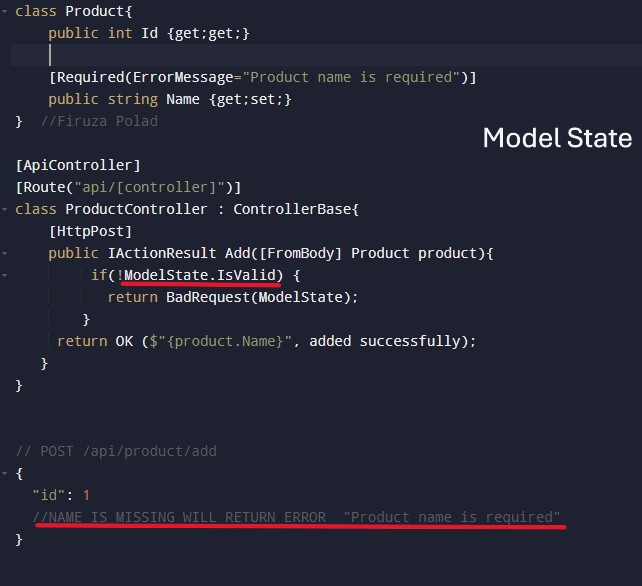 After model binding occurs, to track the validity of model binding, like to check if incoming data is valid according to our model we use it. Used in controller actions and will contain the errors.