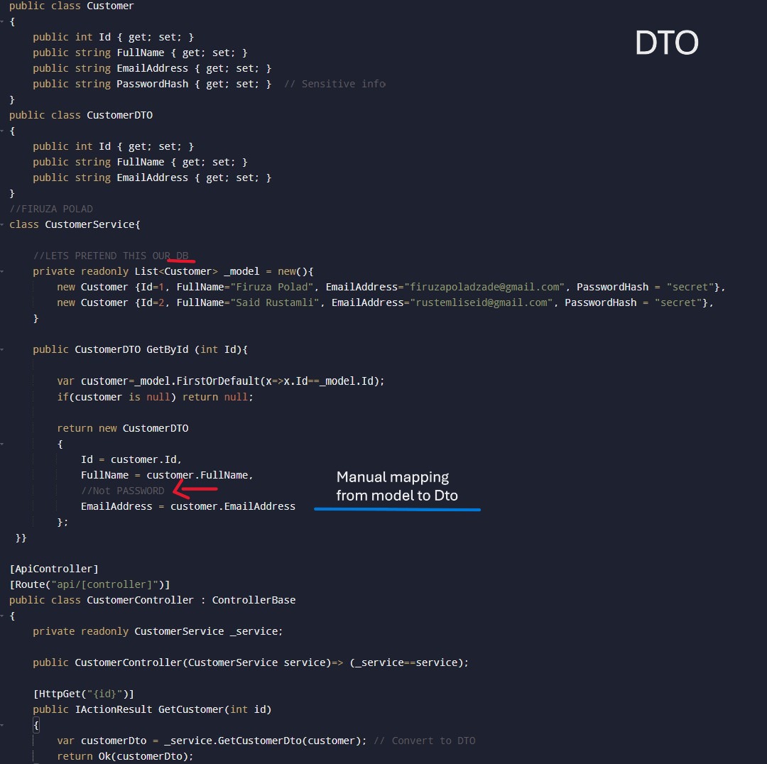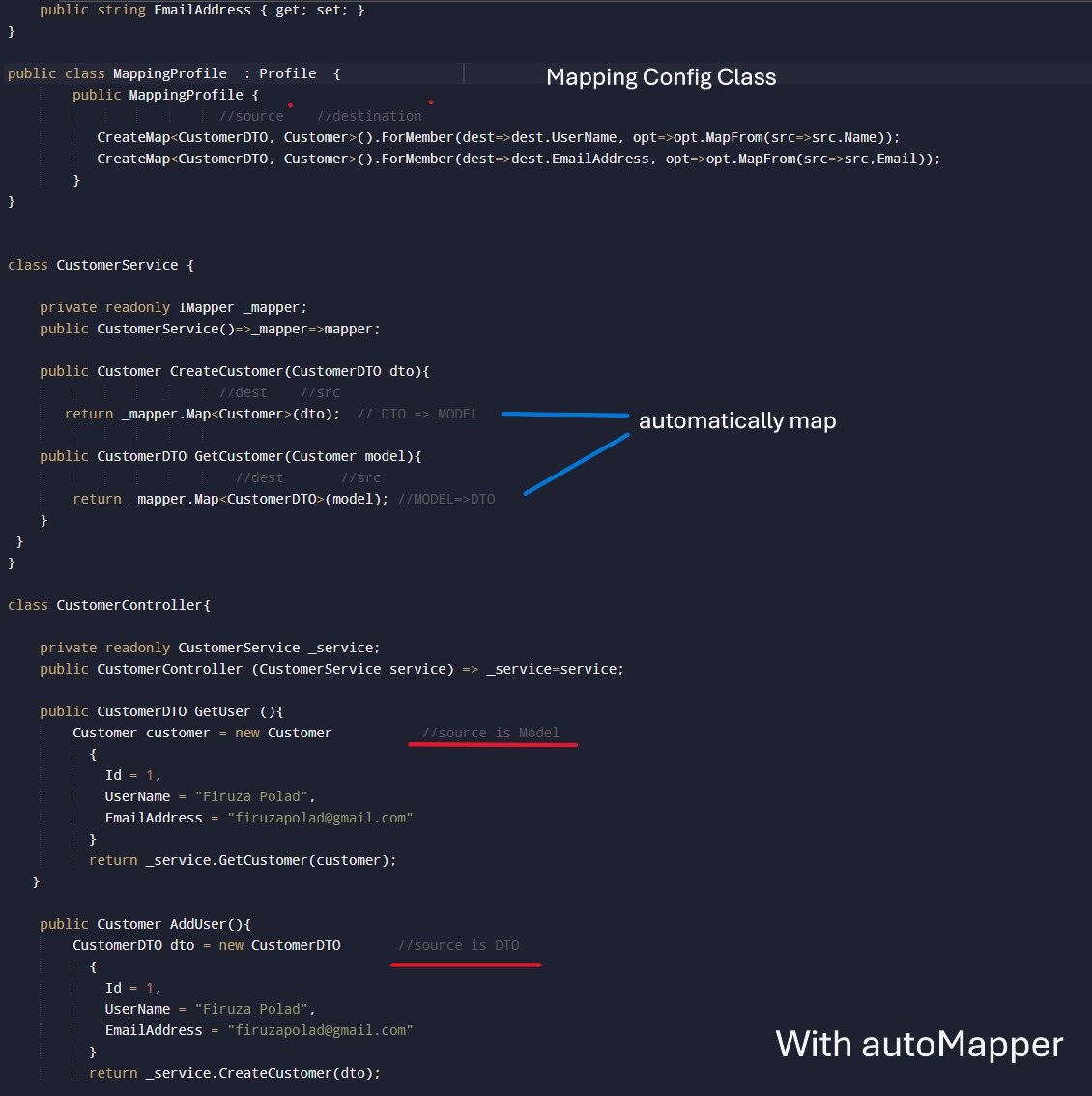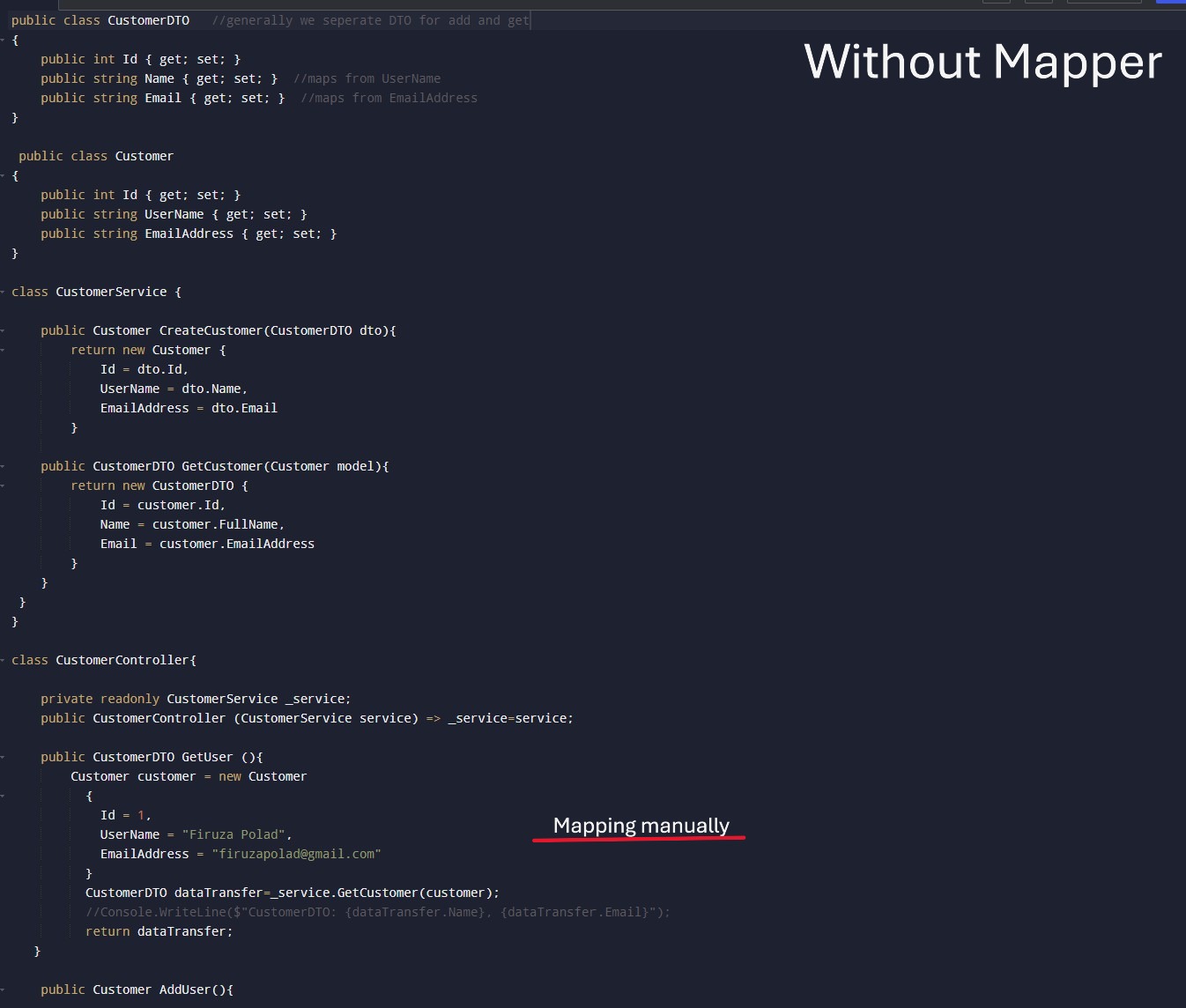 var customer = mapper.Map<Customer>(customerDTO);var customerDTO = mapper.Map<CustomerDTO>(Customer);_mapper.Map(updateDto, Customer); (Updates existing object instead of creating new one).Below image, without AutoMapper PROBLEM: if the data properties are increased, manual mapping becomes repetitive and messy.