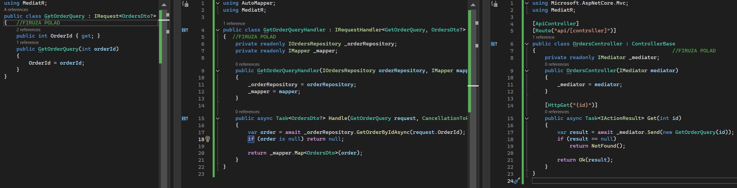 send request to MediatR and It will route it to coreccet handler. This help to keep clean